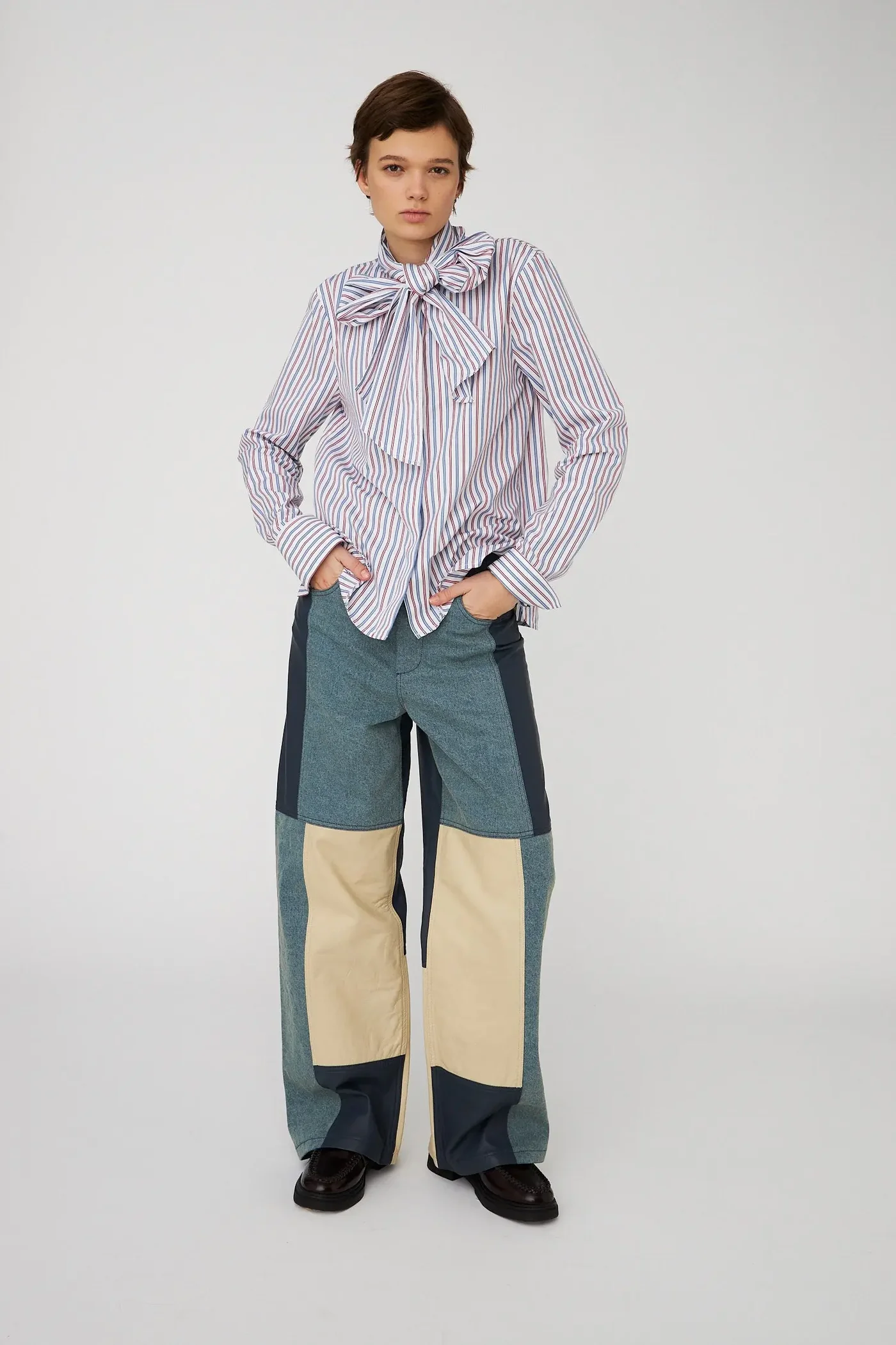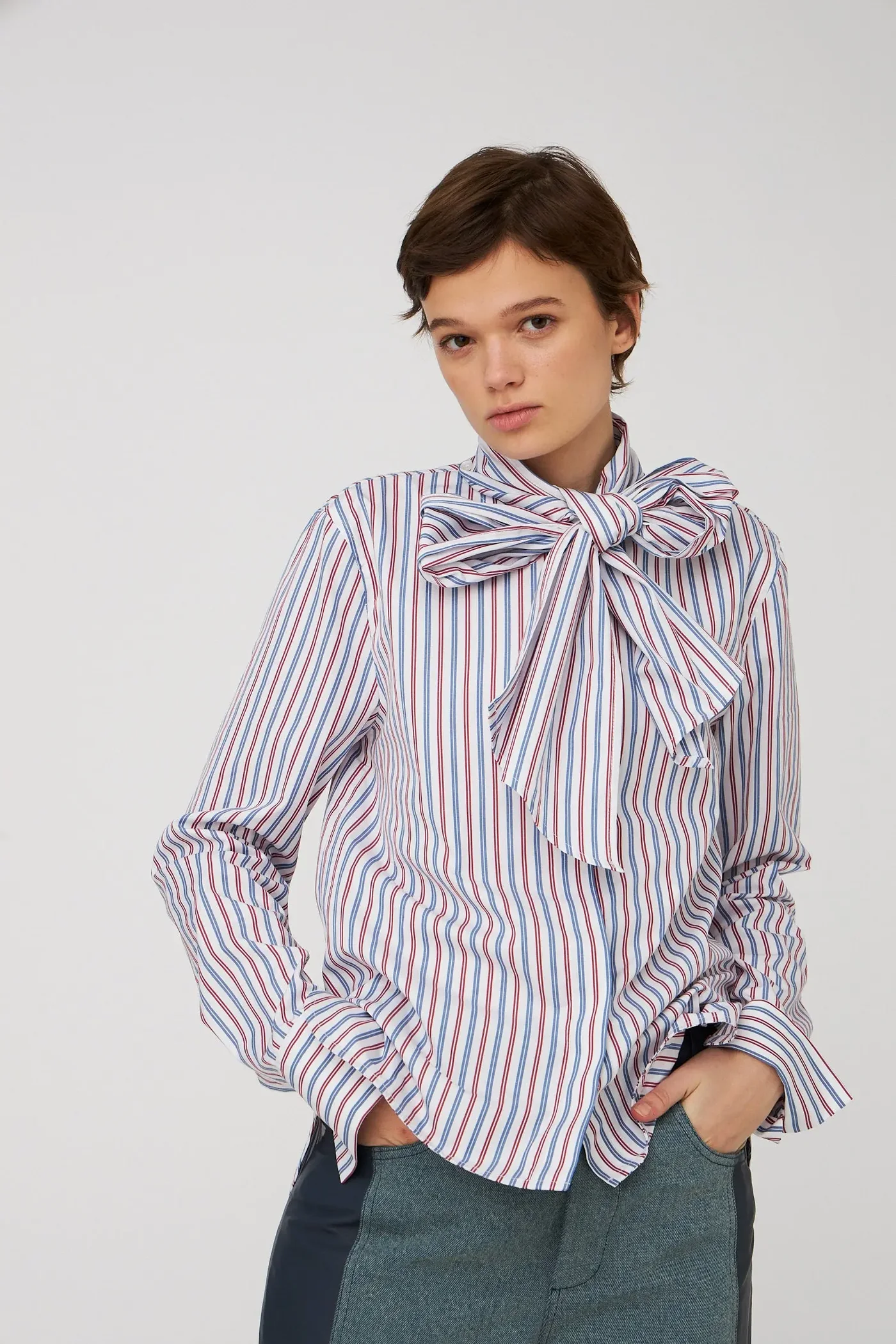 Light cotton shirt with a neck tie bow. The shirt features buttons down centerfront and has long sleeves and cuffs with buttons.