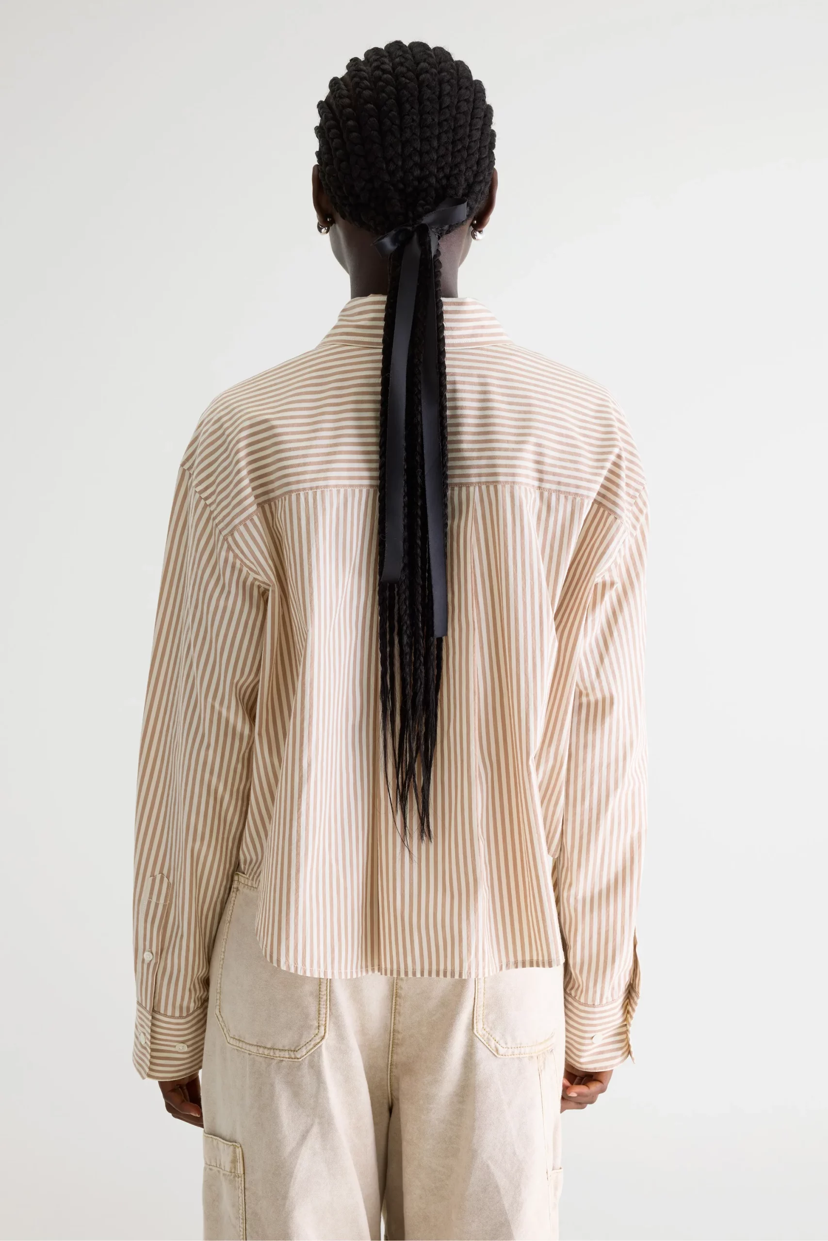 Relaxed cropped shirt made from cotton with tan and white stripes.